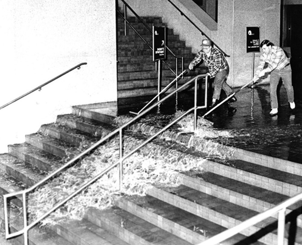 Almost from the start, water problems plagued the Justice Center. In January 1977, just months after it opened, several floors of the Courts Tower were flooded when, as the result of an electrial power outage, a pump for a holding tank failed. That was only the beginning of the water problems. The Galleria's glass roof sprung leaks in the early years. Visitors often found themselves having to maneuver around buckets placed strategically on the floor to catch water dripping down from three stories above. In this photo taken on January 13, 1982, workers were called on to address yet another water problem, a burst sprinkler line. | Source: Cleveland State University, Michael Schwartz Library, Special CollectionsDownload Original File
