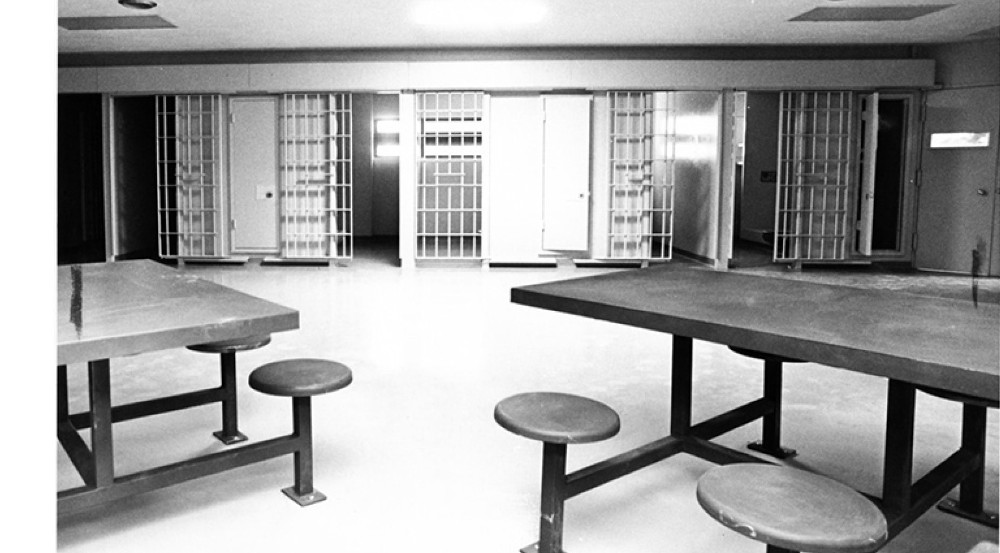 A view of a maximum security area in the County Jail, known as the Detention Center, taken on July 5, 1977. By the 1990s, the Detention Center was severely overcrowded, compelling the County, in 1994, to build a connecting jail annex--called Jail II--on the site. | Source: Cleveland State University, Michael Schwartz Library, Special CollectionsDownload Original File
