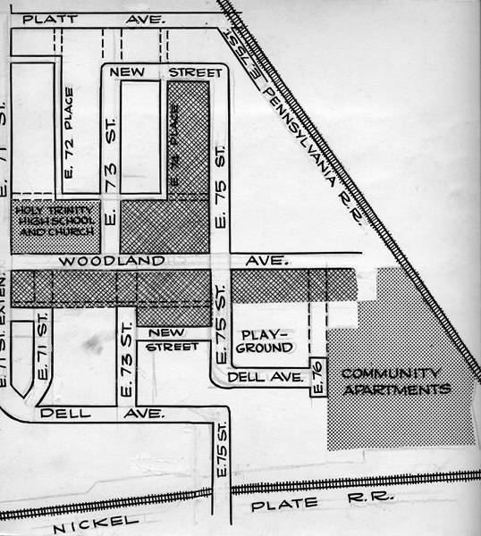 The East Woodland renewal area, like Gladstone, another renewal area several blocks to the west, proved unable to attract a significant influx of new industries. | Creator: Cleveland Press | Date: March 27, 1959 | Source: Cleveland Memory Project, Cleveland State University Library Special CollectionsDownload Original File