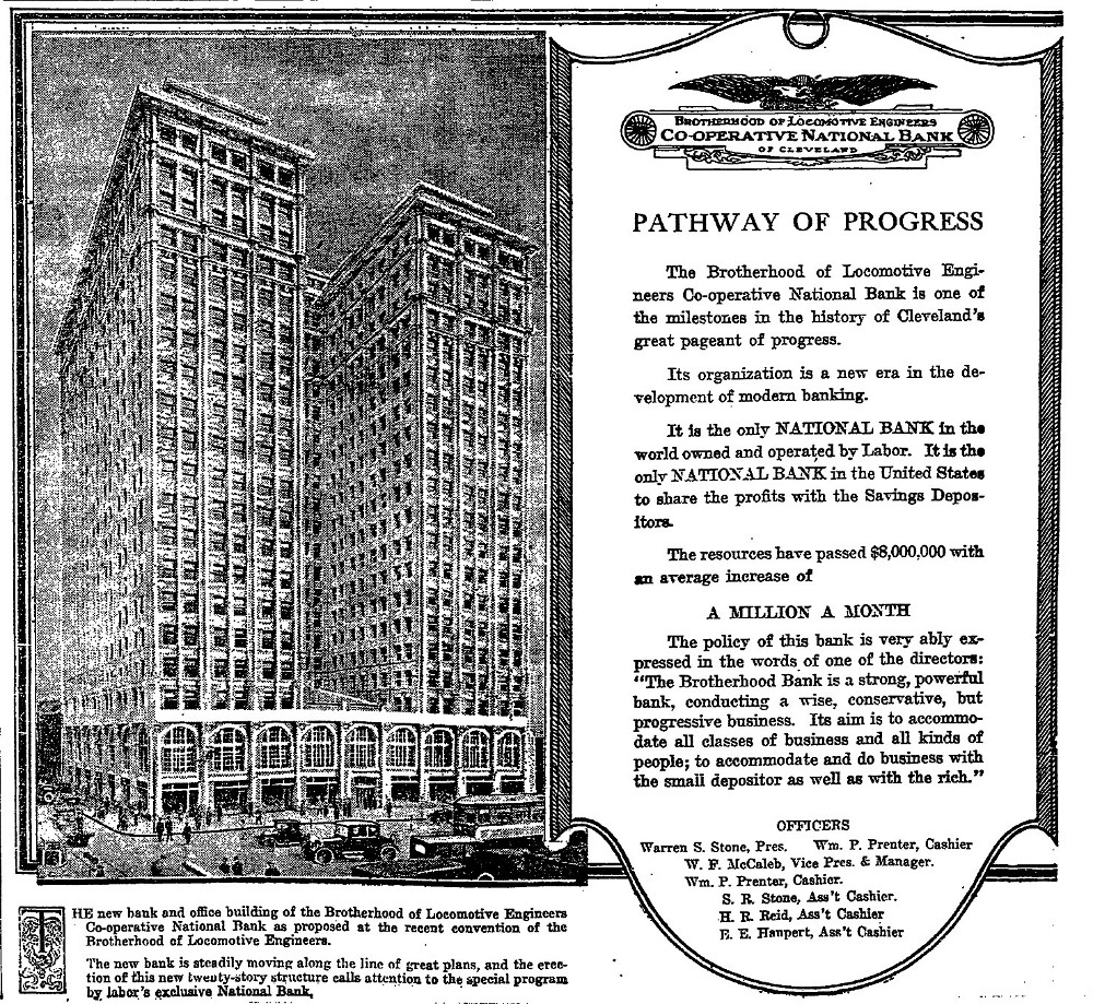This ad for the Brotherhood of Engineers Cooperative National Bank--known as the Engineers Bank-- appeared in the Cleveland Plain Dealer on July 23, 1921. Founded in 1920, it was the first union-owned bank in the United States. The ad features a sketch of the proposed bank building that the union would later build on the southwest corner of Ontario Street and St. Clair Avenue during the years 1923-1925. Today, that building is known as the Standard Building. | Date: July 23, 1921 | Source: Cleveland State University, Michael Schwartz Library, Special Collections