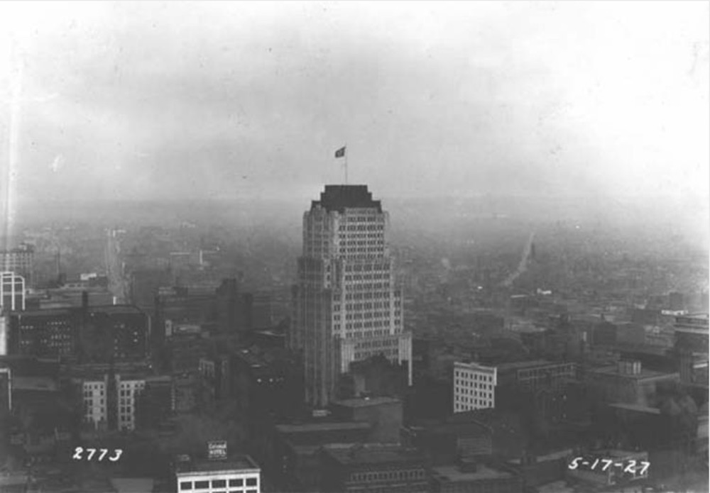 This view is looking east from the Terminal Tower, then under construction, towards the Ohio Bell Telephone building on Prospect Avenue. The Terminal Tower soon eclipsed the still-new Ohio Bell building as the city's tallest. | Date: May 17, 1927 | Source: Cleveland Memory Project, Cleveland State University Library Special CollectionsDownload Original File