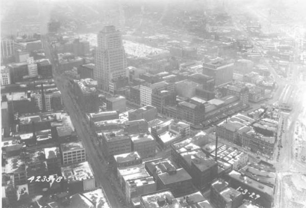 View of the Ohio Bell Telephone Building from the Terminal Tower. By the time this photo was taken, the Terminal Tower had risen to its full height of 708 feet, almost twice as tall as the Ohio Bell building. | Date: January 3, 1929 | Source: Cleveland Memory Project, Cleveland State University Library Special CollectionsDownload Original File