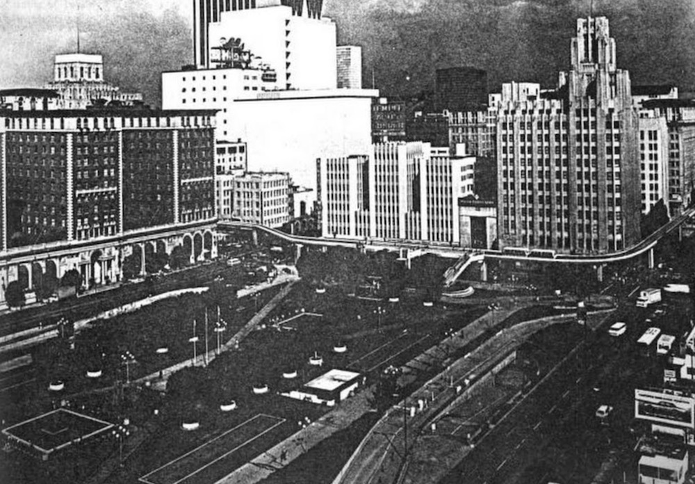 Los Angeles was among five cities, along with Cleveland, Houston, Miami, and St. Paul, to receive new allocations from UMTA for DPM systems. This photo shows a superimposed rendering of the guideway and station at Pershing Square. | Creator: Urban Mass Transportation Administration, Draft Environmental Impact Statement: Downtown People Mover, Los Angeles, California, 1979, via Google Books | Date: 1979Download Original File