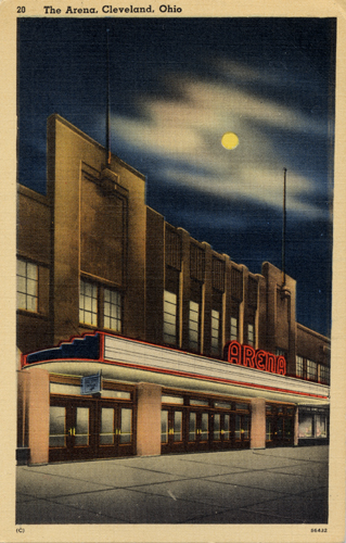 The back of this postcard reads: "The Arena is Cleveland's most modern structure devoted exclusively to sports events. It is here the Cleveland hockey team, the Barons, play their home games. The Arena is also used for such other sport events as Roller Derbies, Wrestling, Six Day Bicycle Races, etc."