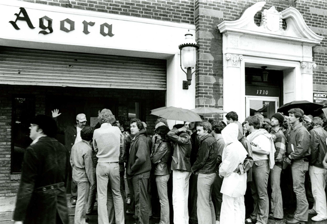 Crowds line up at the Agora ID: 8525 | This file appears in: The Cleveland Agora Crowds line up at the Agora near Euclid Avenue and East 24th Street, 1970s. | Source: Agora Theater Download Original File SourceAgora Theater "Crowds line up at the Agora" appears in: The Cleveland Agora