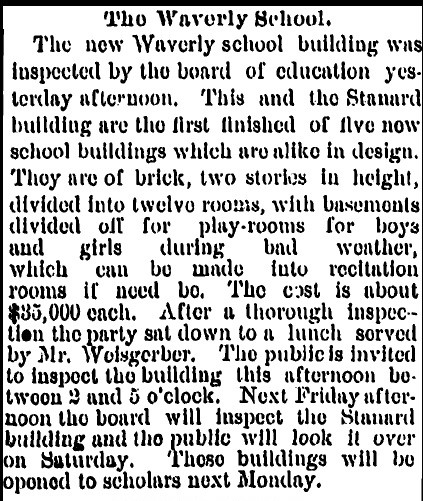 This article which appeared in the Cleveland Plain Dealer on February 4, 1884, describes the new Waverly School building. | Source: Cleveland State University, Michael Schwartz Library, Special CollectionsDownload Original File