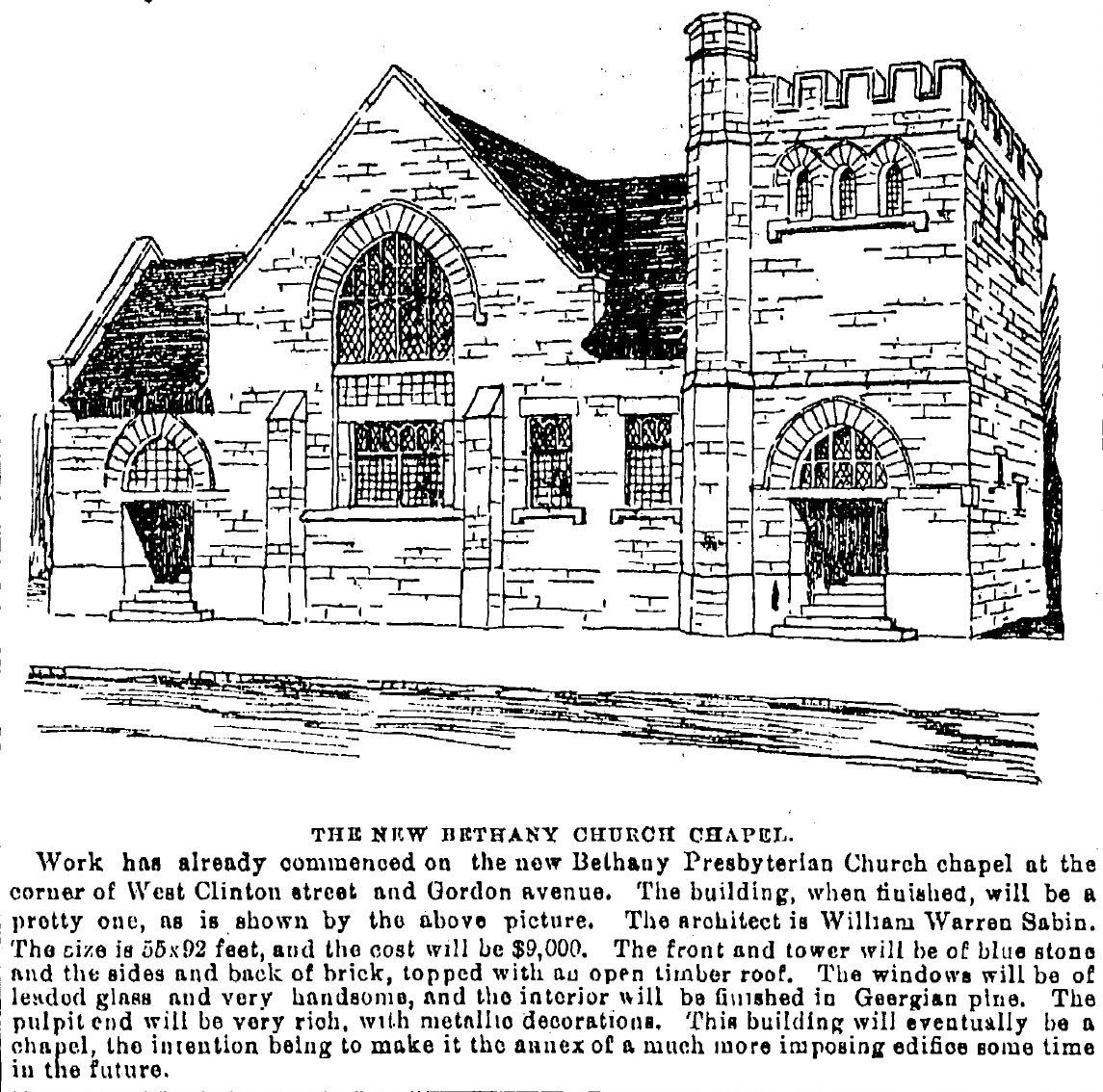 This sketch of the new Bethany Presbyterian Church appeared n the October 20, 1894 edition of the Cleveland Leader. The entrance faced West Clinton, because the parish intended it to eventually become a chapel, with a new and larger church fronting on West 65th Street. | Source: Cleveland State University, Michael Schwartz Library, Special CollectionsDownload Original File
