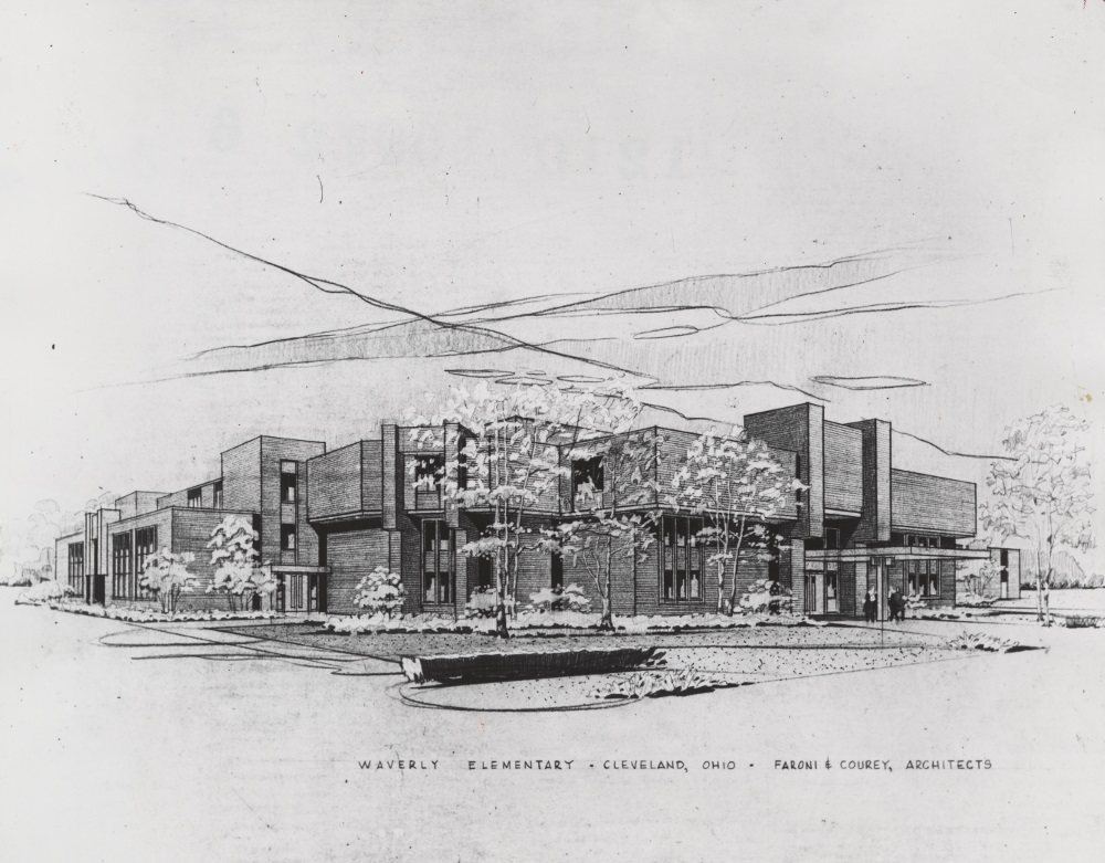 1976 Architect's sketch of the proposed new school on West 54th Street. Construction of the new school building, which had 31 classrooms, was completed in 1978. Classes began there in the Fall of that year. In 2017, this building is being razed and replaced by the third Cleveland school building to be named "Waverly." | Source: Cleveland Public Library, Photograph CollectionDownload Original File