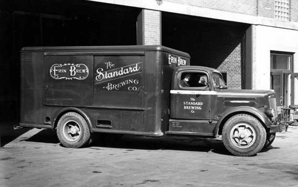 In 1950, a delivery truck exits a garage at the Standard Brewing Company on Train Avenue on the west side of Cleveland. The garage was part of the new bottling plant built by the company in 1950. Today this building is home to a UHaul moving and storage facility. | Source: Cleveland State University, Michael Schwartz Library, Special CollectionsDownload Original File