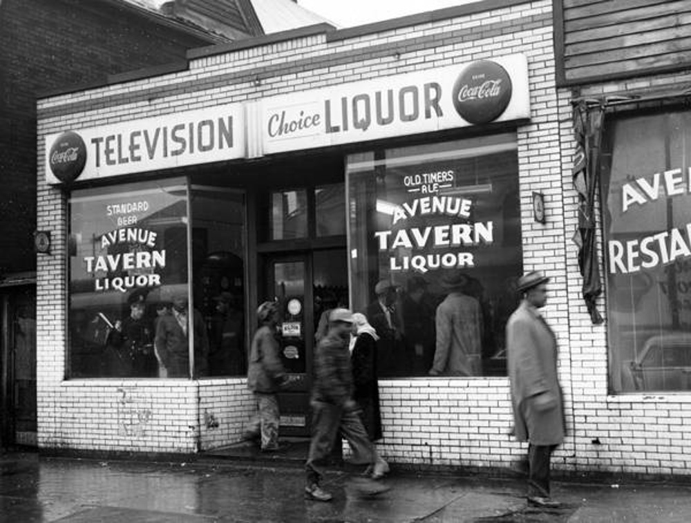 A sign advertising that it serves Standard Brewing Beer is seen on the window of Avenue Tavern at 3021 Woodland Avenue in 1950. While at one time, Erin Brew was popular only on Cleveland's west side, its popularity spread across town after the company began sponsoring the broadcasts of Indians games in 1946. | Source: Cleveland State University, Michael Schwartz Library, Special CollectionsDownload Original File