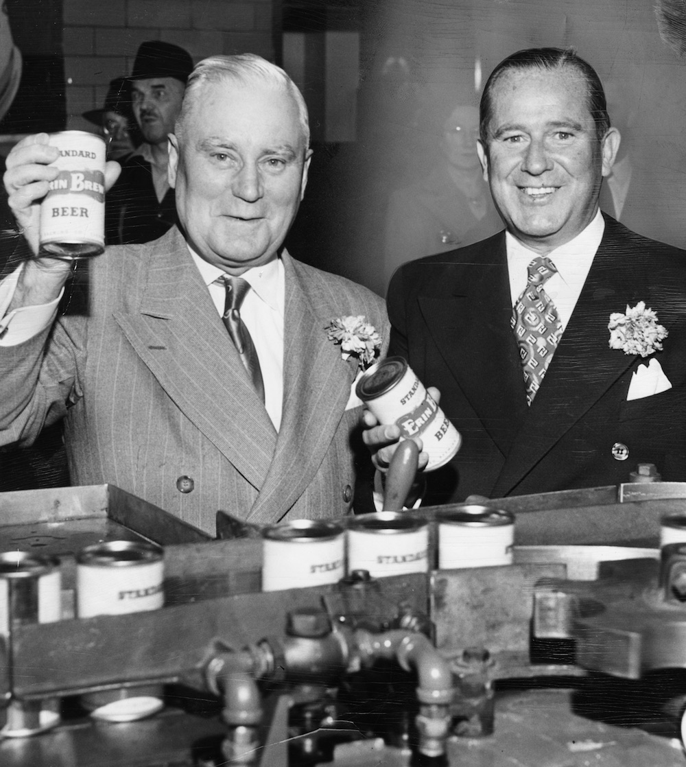 Joseph T. Feighan, president of the Standard Brewing Company (left), and George E. Creadon, general manager, celebrate the first canned beer at the company's new production facility on Train Avenue, on April 21, 1950. | Source: Cleveland Public Library, Photo CollectionDownload Original File