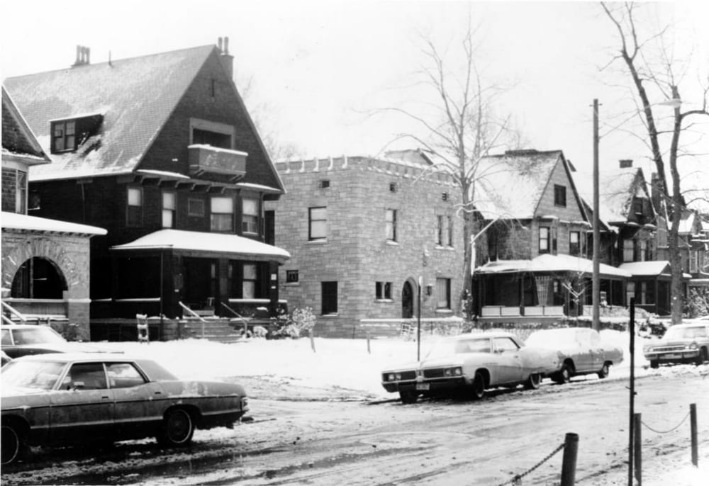 The block of East 75th Street between Euclid and Chester Avenues had homes or apartment buildings erected in each available lot. The Schweinfurth residence, when placed along side its more traditional neighbors, stands out architecturally. Over time many of the homes fell into disrepair and were torn down. The house to the left of the Schweinfurth residence no longer stands. | Date: ca. 1970 | Source: Cleveland Public Library Digital Photograph Collection | Rights: Copyright Not EvaluatedDownload Original File