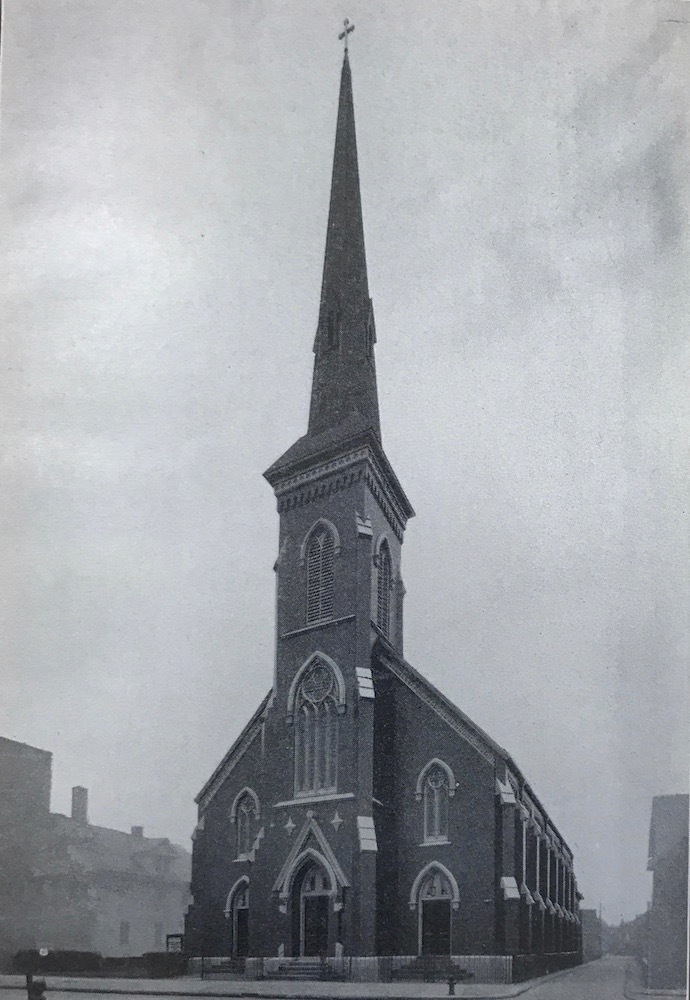 The parish of Trinity Lutheran began as a mission of Zion Evangelical in 1853. This red brick Victorian Gothic church with its 175 foot high steeple is the third church of this parish. It was built in 1873 at a cost of approximately $30,000. This photograph was taken in circa 1903. | Source: Trinity Evangelical Lutheran ChurchDownload Original File