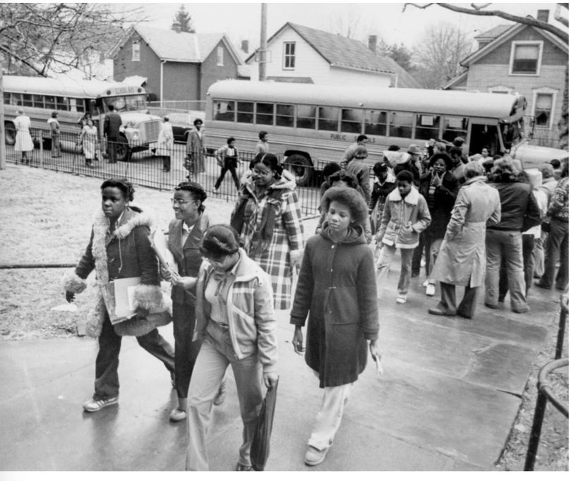 Pupils arrive at Thomas Jefferson Junior High, 3145 West 46th St. on first full day of Phase 2 desegregation from the east-side Glenville neighborhood. | Date: March 24, 1980 | Source: The Cleveland Press Collection, Michael Schwartz Library, Cleveland State University.Download Original File