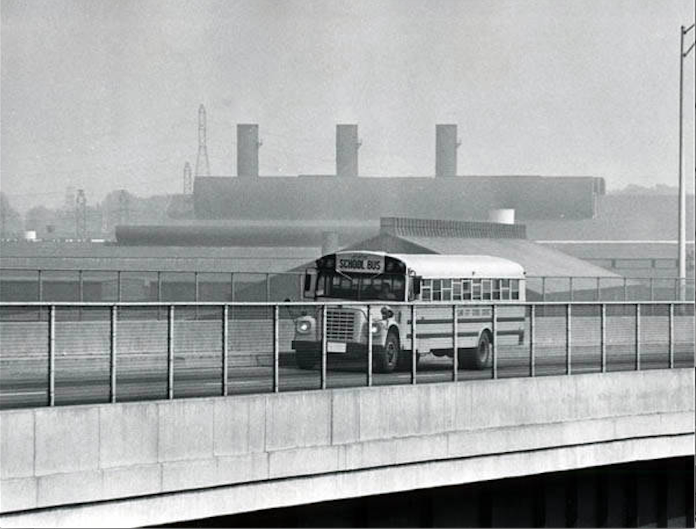 The east to west thoroughfares in Cleveland were popular bus routes for students. This routine site marked the landscape during the 1980's as buses crossed the Harvard-Denison bridge through the city's southern neighborhoods and industrial flats. | Date: December 11, 1979 | Source: The Cleveland Press Collection, Michael Schwartz Library, Cleveland State University.