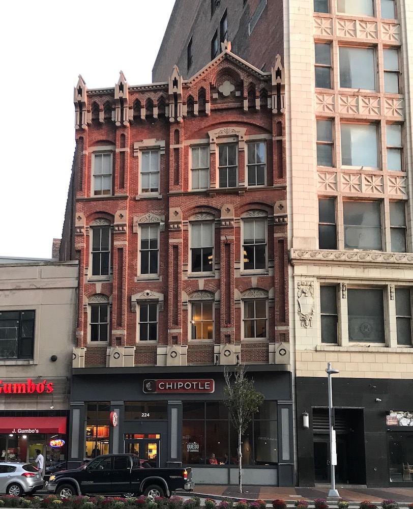 This photograph taken in 2017 shows the restored Cusing Building. In 1999, according to Cleveland city records, the marble and granite stone covering on the building's original facade was removed, restoring this beautiful high Victorian Gothic building to public view. | Source: Jim DubelkoDownload Original File