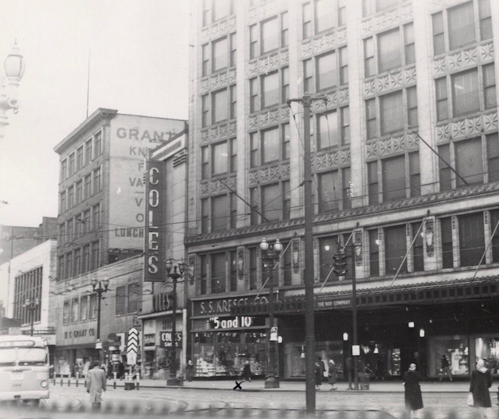 In the 1940s, several years after the 1939 death of Dr. Harvey Cushing, the Cushing Building was purchased by the parent company of Coles Shoes. The company covered the Cushing Building with marble and granite stone, completely hiding its Victorian architecture, as can be seen in this 1950 photograph. The Cushing Building (which after 1937 often referred to as the Coles Building), is the building to which the large "Coles" sign is attached. Note that the Cushing Block ,the Euclid Avenue Block, the Cobb Building and the Hardy Block were no longer standing when this photograph was taken. The Cushing and Euclid Avenue Blocks were razed in 1915 and replaced by the new May Company Building. The Hardy Block too was razed in 1915 and replaced by the Ames Building. In 1940, the first two floors of the facade of the Ames Building were remodeled when it became part of the new W. T. Grant Co. store.. The rest of that store was created by razing the Cobb Building immediately to the west and replacing it with a new two-story building with a facade that matched the remodeled facade of the former Ames Building . | Source: Cleveland Public Library, Digital Photograph CollectionDownload Original File