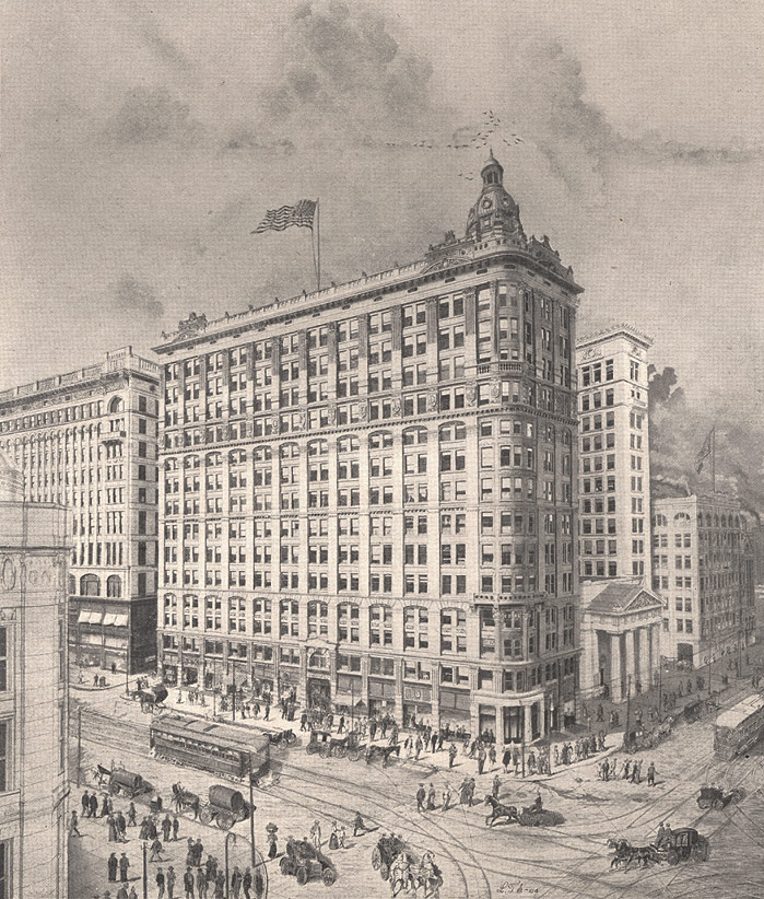 This vintage postcard view shows the removed cupola. The depiction appears to be from the early 1900s, judging by both the horse-drawn carriages and the streetcars. | Source: http://www.clevelandskyscrapers.com/