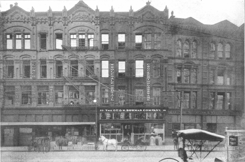 Located on the southside of Euclid Avenue, between East 1st and East 3rd Streets, the building was erected 1874, a year within a decade that witnessed the transformation of the south side of Public Square and lower Euclid Avenue from a residential to commercial neighborhood. This 1905 photograph shows the Cushing Building (center) at a time when it was occupied by the George H. Bowman Co., a china and glassware store. To the viewer's left is the Cobb Building, which was built at the same time as the Cushing Building. The two buildings shared a common party wall, until the Cobb Building was razed in 1940. To the viewer's right is a portion of the Euclid Avenue Block, which was torn down in 1915 to make room for the new May Company Building. | Creator: Cleveland Public LibraryDownload Original File