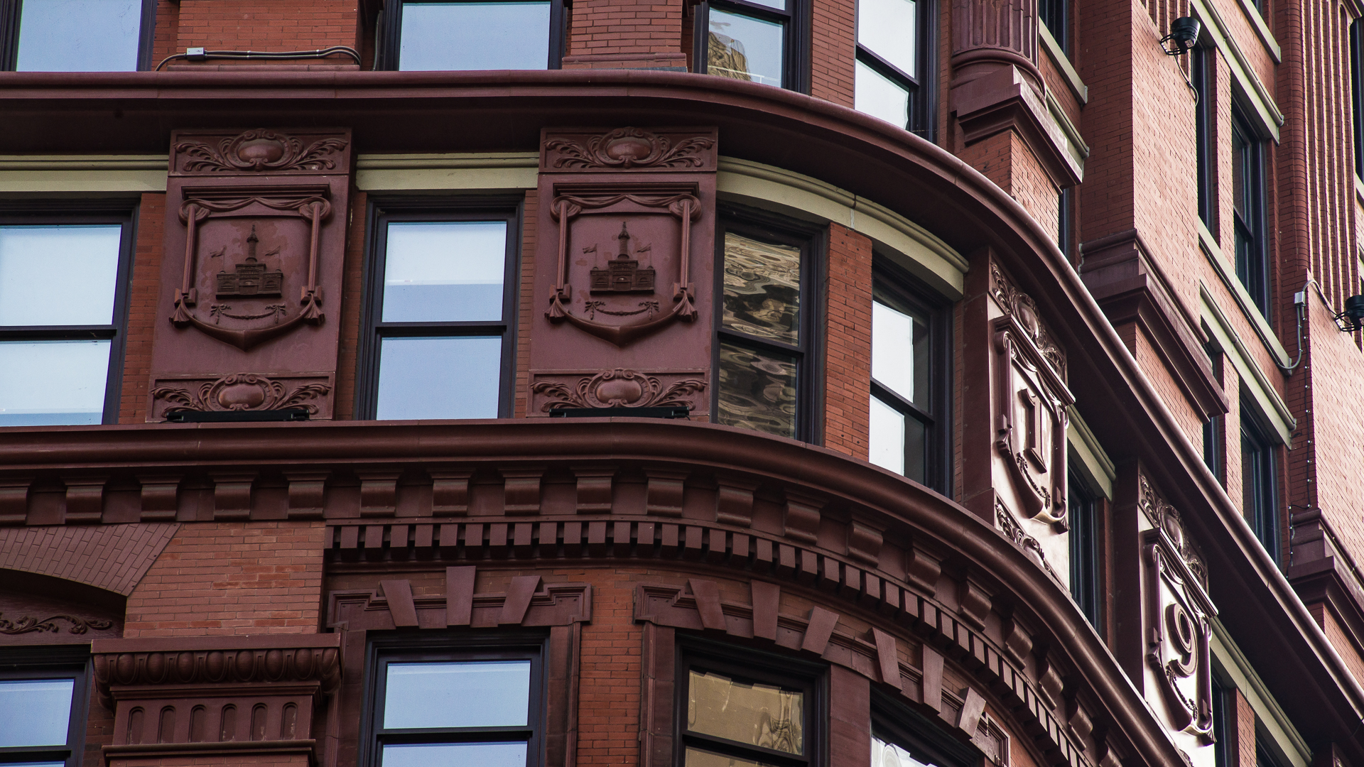 Depicted on the side of the Schofield building is another design of Levi T. Schofield: The Soldiers and Sailors Monument. The monument was built to honor the 10,000 Cuyahoga county residents who fought in the Civil War and was dedicated on August 25, 1891. | Creator: Madeline Hoyle | Date: September 10, 2017