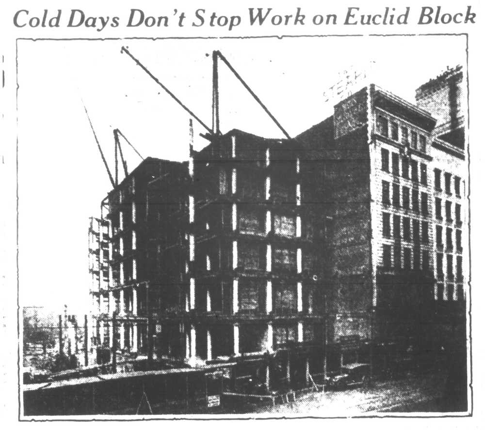 In 1917, as the above photo taken from the January 20, 1917 edition of the Cleveland Plain Dealer shows, the western portion of the John Hartness Brown Building underwent a massive reconstruction which dramatically changed its facade and added 40 feet of frontage to the building. Today the only part of the exterior of the orignal building which remains the same is a portion of its rear facade. | Source: Cleveland Public Library, Historic Newspaper CollectionDownload Original File