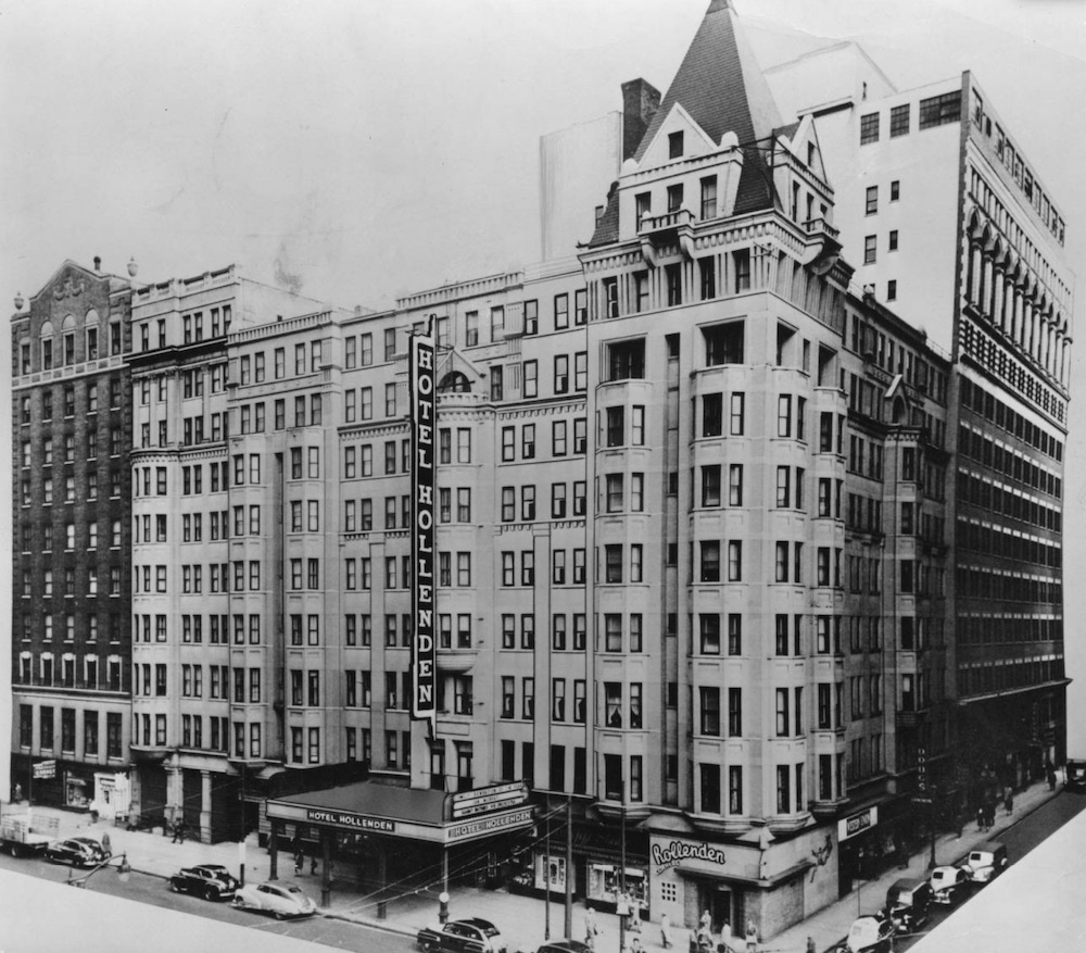 This image depicts the Hollenden Hotel in its later years. In this photograph, you can see the businesses located on the first floor of the building. On the marquee in front of the hotel, they are advertising the Sammy Watkins Orchestra, which Dean Martin regularly performed with. | Date: 1950 | Source: Cleveland Public Library, Photograph CollectionDownload Original File