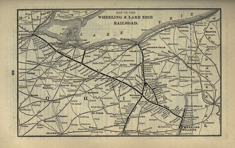 This 1901 map displays the two main lines of the Wheeling & Lake Erie Railroad in 1901. The tracks, over 400 miles long, reaching from Cleveland to Zanesville and Toledo to Wheeling, converged in Harmon, Ohio. This intersection created the railroad's nickname "Cleveland's Iron Cross." | Date: 1901 | Source: Poor's Manual of RailroadsDownload Original File