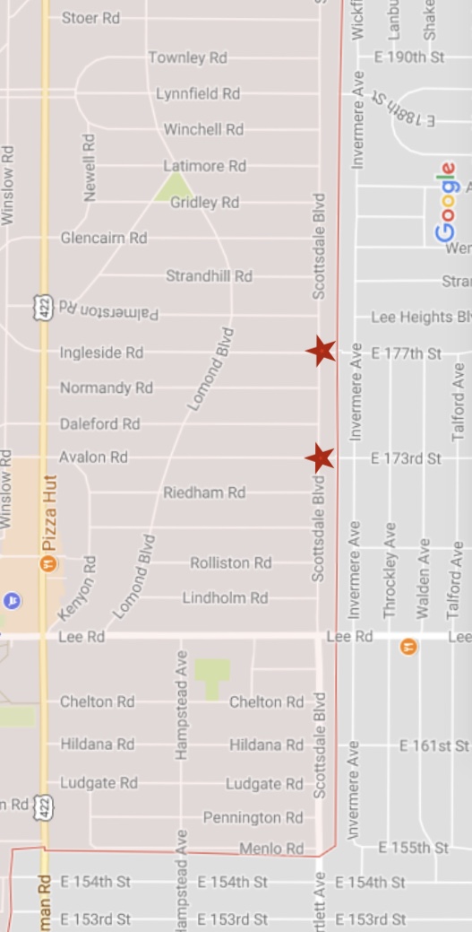 Map with markers indicating the two barricades that still stand today at Avalon and Ingleside Roads at Scottsdale Boulevard. The top of the image indicating East, not North. | Date: November 2017 | Source: Google Maps | Rights: Google Download Original File