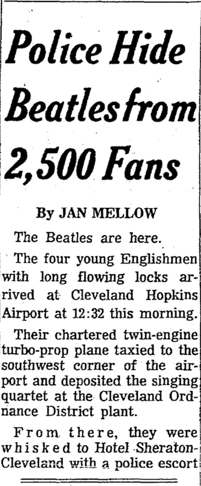 Headline from an article in the Cleveland Plain Dealer, showcasing the police presence needed for the Beatles arrival in Cleveland. A full one-third of Cleveland’s police force was scheduled to be downtown as of September 12, 1964, according to the Police Chief at the time, Richard R. Wagner. The concert, according to many sources, was pandemonium from the beginning. Regardless of the number of police officers and barricades placed around the stage, the sheer numbers of fans wanting to get close to, touch, and in general crowd the band caused mass chaos. | Date: September 15, 1964 | Source: Cleveland Plain DealerDownload Original File