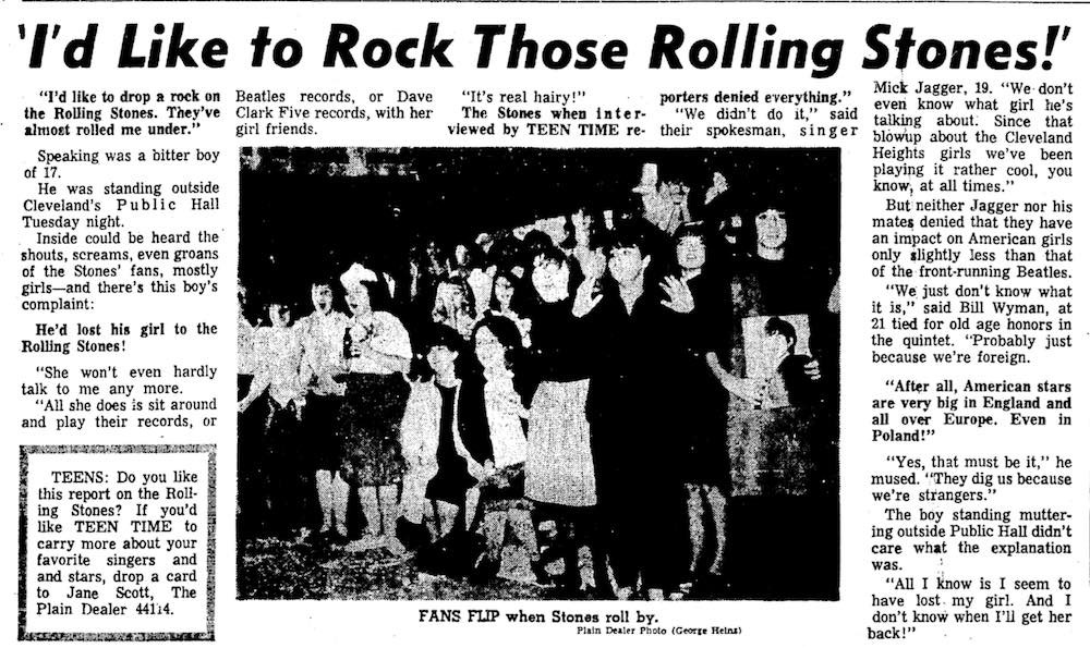 I'd Like to Rock Those Rolling Stones ID: 8925 | This file appears in: Cleveland Public Hall's Rock and Roll Roots Article about the reaction of fans to the Rolling Stones concert, accompanied by an image of fans | Creator: George Heinz (photo) | Date: November 7, 1964 | Source: Cleveland Plain Dealer Download Original File CreatorGeorge Heinz (photo)SourceCleveland Plain DealerDateNovember 7, 1964 "I'd Like to Rock Those Rolling Stones" appears in: Cleveland Public Hall's Rock and Roll Roots