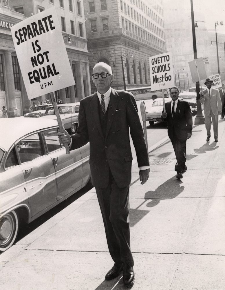 It was while he was living in the Cleveland area that Dr. Benjamin Spock became an activist for social justice causes, sometimes to the dismay of his medical colleagues at Western Reserve University. Here, on September 27, 1963, he marches down East Sixth Street in front of the Cleveland Board of Education Building, protesting segregation in the Cleveland Schools. According to Marvin Rosenberg, the twins' father who was active in the anti-nuclear arms movement of the early 1960s, he believes that he significantly contributed to Spock's decision to become an activist for such causes in this period. | Source: Cleveland Public Library, Photograph CollectionDownload Original File