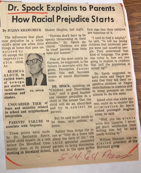 On May 13, 1964, Dr. Benjamin Spock was the guest of honor at a meeting of the Moreland Community Association held at Moreland Elementary School. At the meeting, he gave a fiery speech in which he condemned racial segregation in schools and neighborhoods, and the harmful effect it has upon children of all races. | Source: Case Western Reserve ArchivesDownload Original File