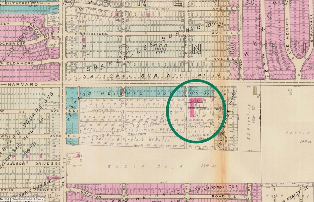 For four decades, Shaker Heights operated its service yard from a five acre site on East 173rd Street, just south of Harvard Avenue, in Cleveland. That site is circled on this 1927-1937 map. When in the early 1960s, Shaker began using the yard as a temporary transfer station for its garbage destined for a landfill in Medina County, nearby residents and businesses in Cleveland complained, leading to a souring of relations between the city and suburb. This intensified Shaker's search, which had begun in the 1950s, to find a site for the service yard within its own city limits. | Source: Cleveland Public Library, Digital Map CollectionDownload Original File