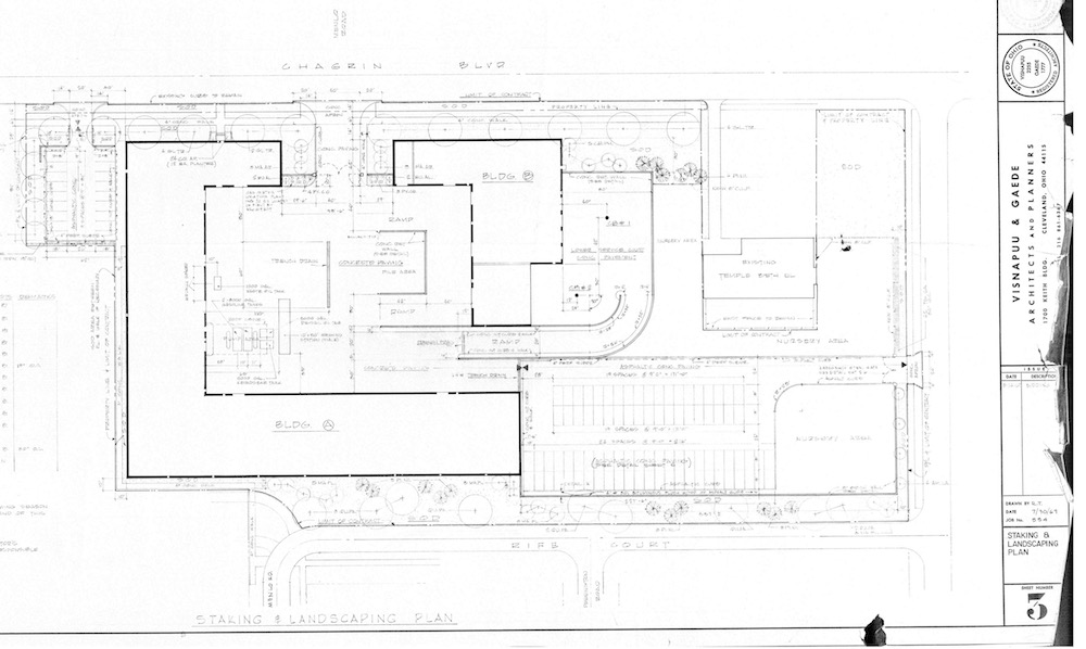 A scaled drawing of the proposed new Service Center by the architectural and planning firm of Visnappuu & Gaede. It is dated July 30, 1969. An examination of the drawing shows the effort that the City made to substantially buffer the center not only from residents living on Menlo, Pennington and Ludgate Roads, but also from businesses and traffic on Chagrin Boulevard. | Source: City of Shaker HeightsDownload Original File