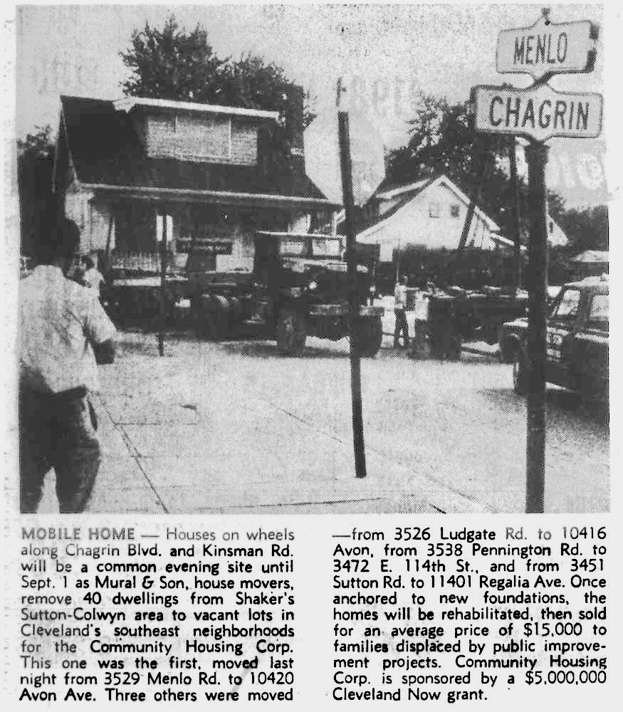 Shaker Heights originally intended to demolish the 32 houses that were located on the site of the proposed new Service Director. However, in 1969, at the request of Cleveland mayor Carl B. Stokes, Shaker Heights entered into an agreement with the Community Housing Corporation providing for that entity to move the most salvageable houses to vacant lots in Cleveland's Mount Pleasant neighborhood. In this photo which appeared in the Cleveland Press on August 14, 1969, the house which was formerly located at 3529 Menlo Road in the Moreland neighborhood is shown being moved west on Chagrin Boulevard. Its destination was a vacant lot at 10420 Avon Road in Cleveland. | Source: Cleveland Public Library, Newspaper CollectionDownload Original File