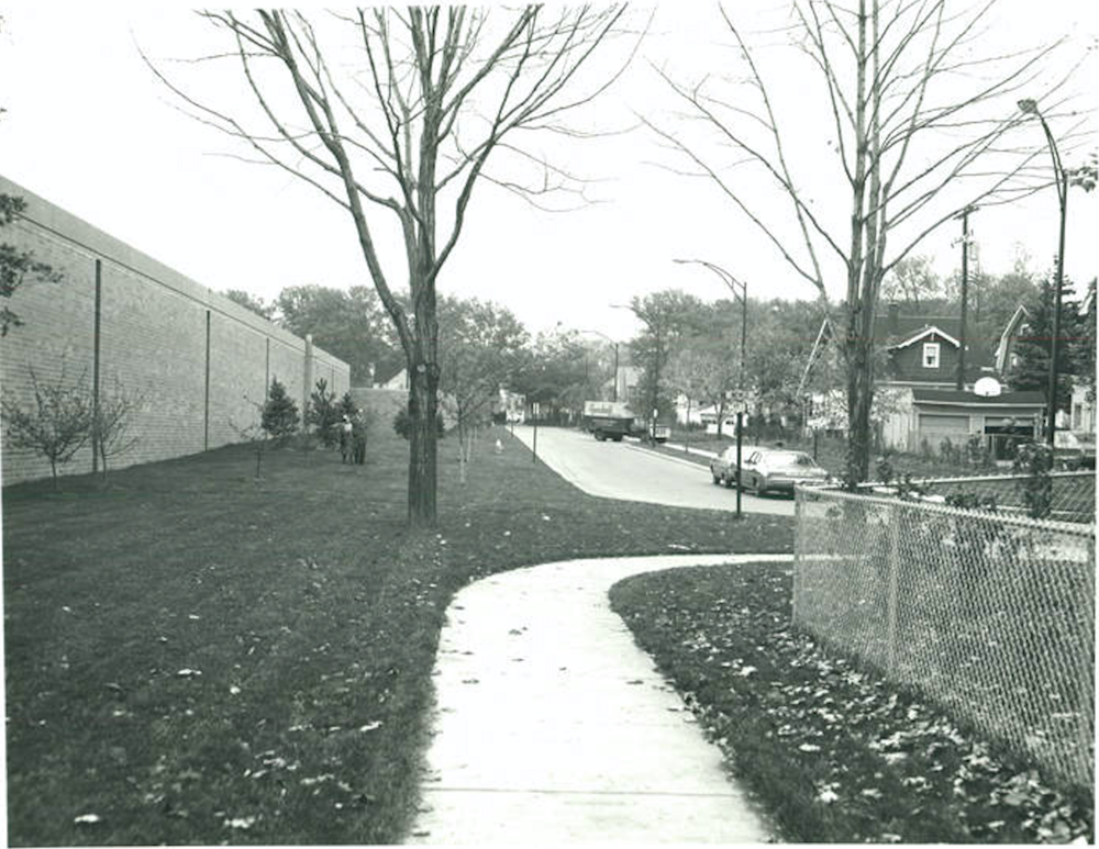 This 1971-1972 photograph presents a view of the buffer of the new Shaker Heights Service Center from the houses located on Menlo and Pennington Roads. | Source: Cleveland State University, Michael Schwartz Library, Special Collections; Shaker Heights Public Library, Local History CollectionDownload Original File