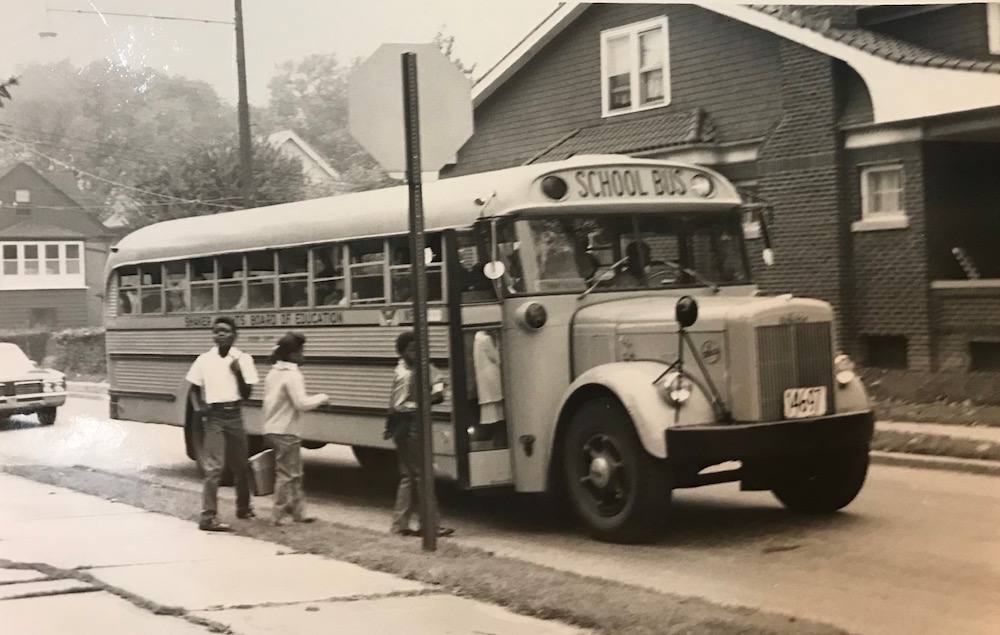 In this 1970 photograph, African American children in the Moreland neighborhood are seen getting onto a school bus which will take them to a predominantly white school in Shaker Heights. | Source: Shaker Heights Public Library, Local History CollectionDownload Original File