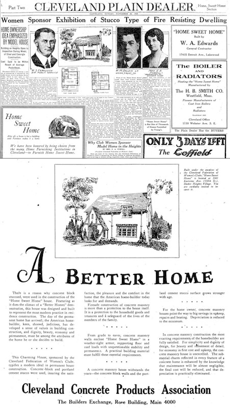 While Van Sweringen interests did not guide the development of the South Moreland neighborhood, they did acquire lands in the North Moreland area. Revamped to meet Van Sweringen standards, the Better Home League of America constructed a model "Home Sweet Home" on the east side of what is now Sutton Road near the South Moreland Boulevard intersection in 1924. The structure was modeled from a national demonstration home constructed on the National Mall in 1923. Constructed of concrete and veneered with stucco, the affordable, fireproof display was meant to promote home ownership. | Source: The Cleveland Plain Dealer, AdvertisementDownload Original File