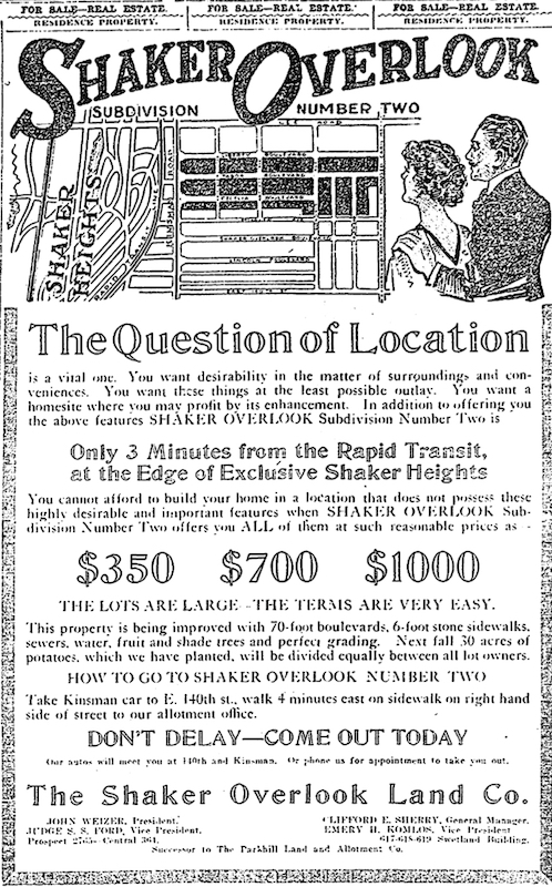 As reflected in the advertisement map, much of what is now the South Moreland neighborhood was part of Shaker Overlook Subdivision Two. The unique character of the neighborhood is tied to efforts of this land company to develop properties and provide quality homes for middle class customers in exclusive environments . | Source: AdvertisementDownload Original File