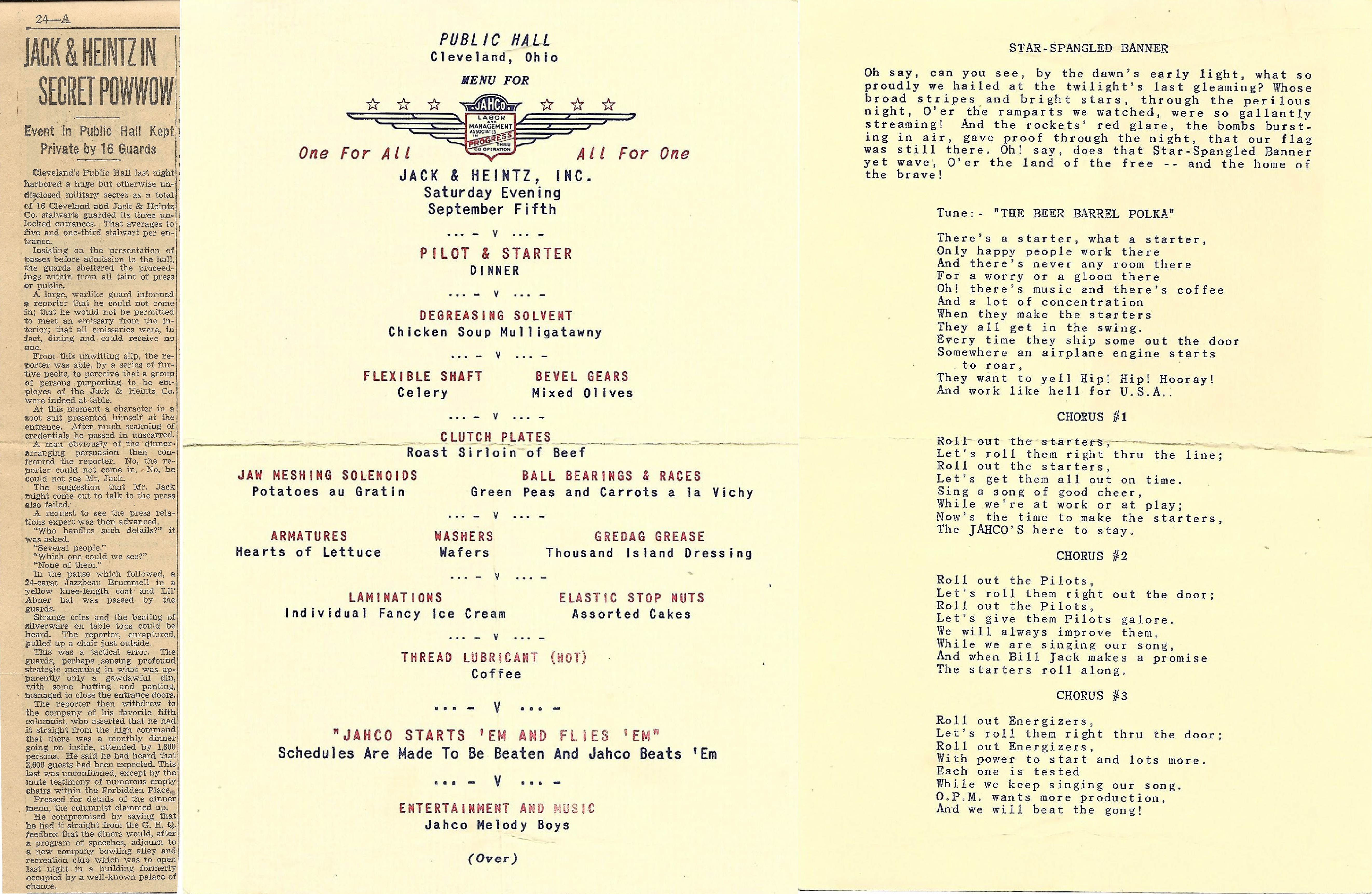 On September 5th, 1942, Jack & Heintz Co. held a large event at Cleveland Public Hall. According to one newspaper account, sixteen private guards "sheltered the proceedings within from all taint of press of public," leading to the impression that the event involved some "undisclosed military secret." The program for the event reveals the dinner menu (wherein the dishes are given engineering-related names) and lyrics for group singalongs, including the national anthem and a JAHCO-themed original to the tune of "Beer Barrel Polka." | Source: Broadview Heights Historical SocietyDownload Original File