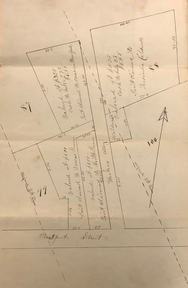 Following Abram Hickox's death in 1845, his house on Prospect Street and nearby lands along Hickox Alley were divided amongst his four daughters. This 1847 plat, which is a part of his Cuyahoga County Probate Court file, shows the location of his lands there and the portion which each of his daughters received from his estate. Shortly thereafter, his daughters sold these lands to early Cleveland real estate developers who built a number of working-class houses on the Alley in the 1850s. | Source: Cuyahoga County Archives