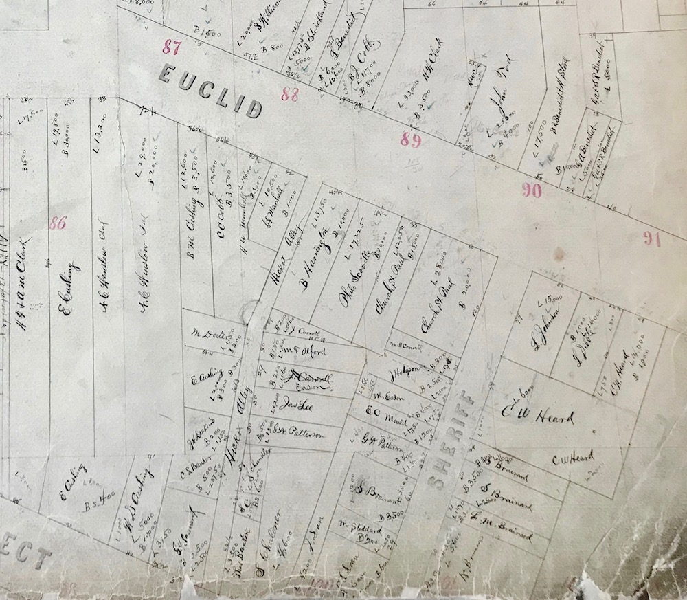 This map, which lists owners' names and land and building values, is instructive of the status and type of development on Euclid and Prospect Streets, as well as Hickox Alley, in that year. The lots along Euclid Avenue have significantly greater building values than the lots on the alley, indicating the presence mostly of commercial buildings on lower Euclid Avenue as it transformed into a commercial district, and mostly of modest residential structures on nearby Hickox Alley. | Source: Cuyahoga County Archives
