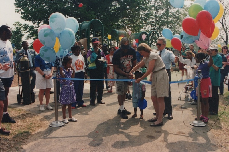 Chelton Park was expanded and renovated by the City of Shaker Heights between 1993 and 1995. Two homes on Chelton Road were purchased and demolished in an effort to provide better visibility into the popular recreation space. Pictured is Mayor Patricia Means cutting the ribbon at the grand opening celebration in 1995. | Source: Shaker Heights Public Library, Local History CollectionDownload Original File
