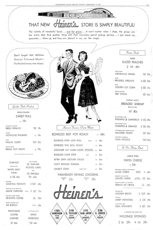 The new store noted in this advertisement was located in University Heights. Similar to the Kinsman Road branch, the store was designed with pastel colored walls, wide aisles and low counters. Occupying 33,000 square feet, customers were offered 128 feet of refrigerated meats, 210 feet of produce cases, 181 feet of frozen food, and 1,015 feet of grocery shelving. | Source: Cleveland Plain Dealer, AdvertisementDownload Original File
