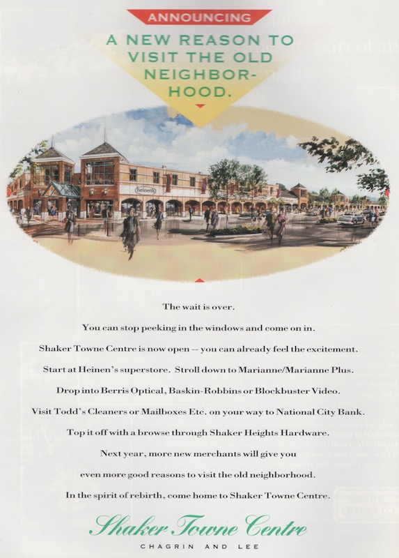 Upon opening in 1992, Shaker Towne Center housed Heinen's Fine Foods, Baskin Robbins, Blockbuster Video, a branch of National City Bank and a variety of small specialty stores. | Source: Shaker Heights Public Library, Local History CollectionDownload Original File