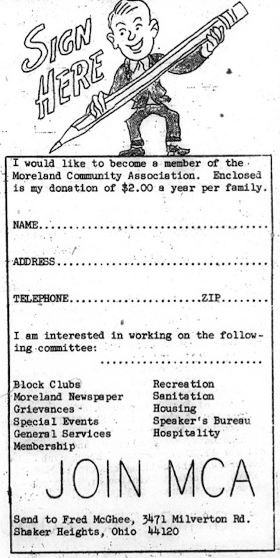 Moreland Commuity Association claimed a membership of 400 families in 1968. While joining the association only cost two dollars per year, the membership role enabled MCA leadership to claim that they spoke as a unified voice for the community. | Source: Cleveland History Center of the Western Reserve Historical SocietyDownload Original File
