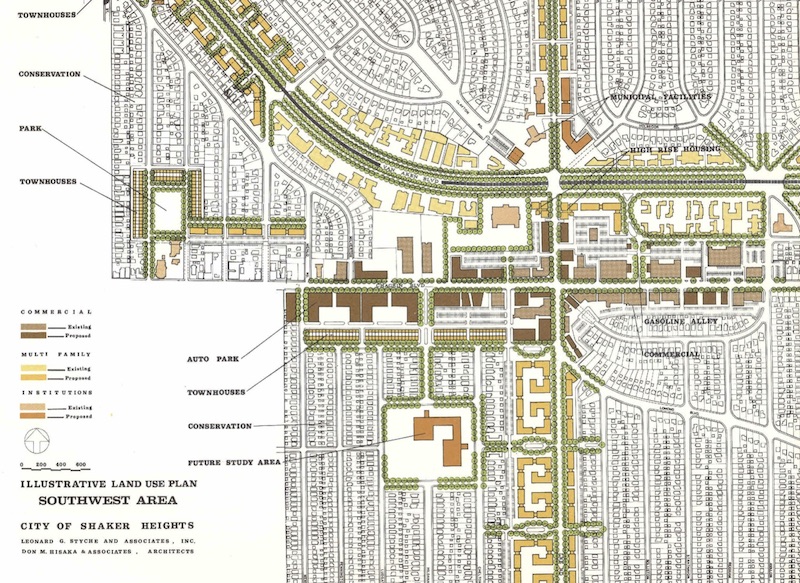 The Styche-Hisaka Plan, an urban renewal plan created for the City of Shaker Heights during the mid 1960s, included an "Auto Park" along both sides of Chagrin Boulevard as part of efforts to revitalize the Chagrin-Lee commercial district. Attempting to build off the popularity of the Kinsman-Lee auto row, the area was planned as a "unique center for comparative auto shopping." | Source: Shaker Heights Public Library, Local History CollectionDownload Original File