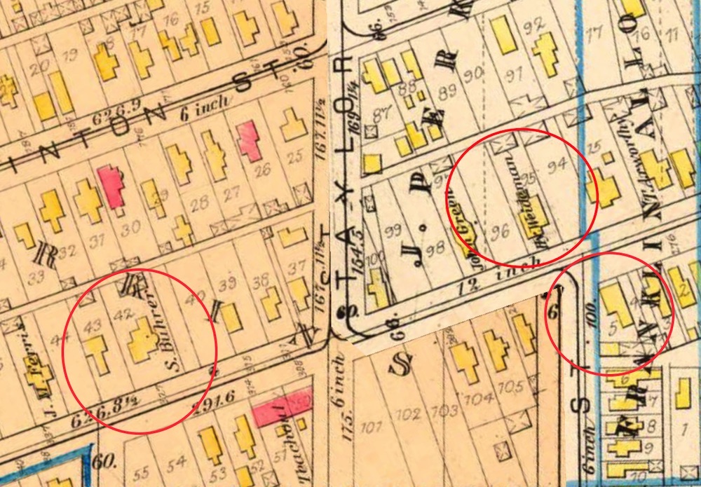 In the mid-nineteenth century, Franklin Avenue was to the west side what Euclid Avenue was to the east--the place where the elites on each side of the Cuyahoga River resided. When Stephen Buhrer moved to 327 Franklin Avenue (4606 Franklin Boulevard today) in 1869, his neighbors included wealthy banker Hannes Tiedemann and the widow of Wisconsin governor William Barstow. On this 1881 map, the Buhrer house is identified within the circle on the left. In the circle directly to the right is Hannes Tiedemann's house, known today as Franklin Castle. Circled below Tiedemann's house is the house that was rented in 1868 by Maria Barstow. Her son Frank later married Stephen Buhrer's daughter Lois, obtained a job with John D. Rockefeller's Standard Oil company, and by the early twentieth century was a very rich man. | Source: Cleveland Public Library, Digital Map CollectionDownload Original File