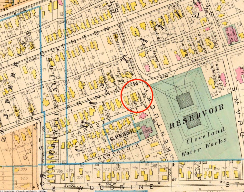 This section of that map shows (circled in red) sublots 88 and 89 of the Charles Taylor Farm allotment upon which were built Cleveland Mayor Irvine U. Masters' Greek Revival-style house in 1853 and Belden Seymour's grand Italianate house in 1874. | Source: Cleveland Public Library, Digital Map CollectionDownload Original File