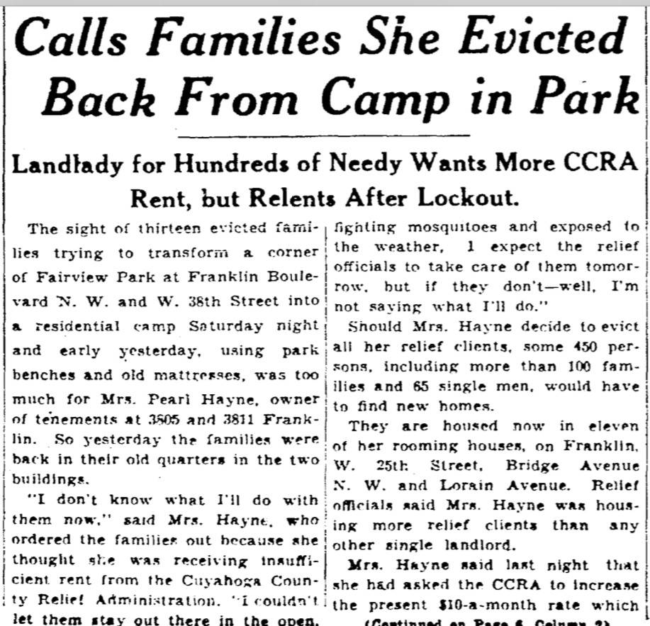 In 1934 during the Great Depression, Pearl Hayne, unhappy with the County relief payments she was receiving for her low-income tenants at 3805 and 3811 Franklin Boulevard, evicted 13 of them, who moved into tents at nearby Fairview Park on the southeast corner of Franklin Boulevard and West 38th Street. Eventually she relented and allowed them to return to their suites. County officials said that Hayne, at this time, was housing the most relief tenants in the city of Cleveland. This article appeared in the Cleveland Plain Dealer on June 18 of that year. | Source: Cleveland Public Library, Digital Newspaper CollectionDownload Original File